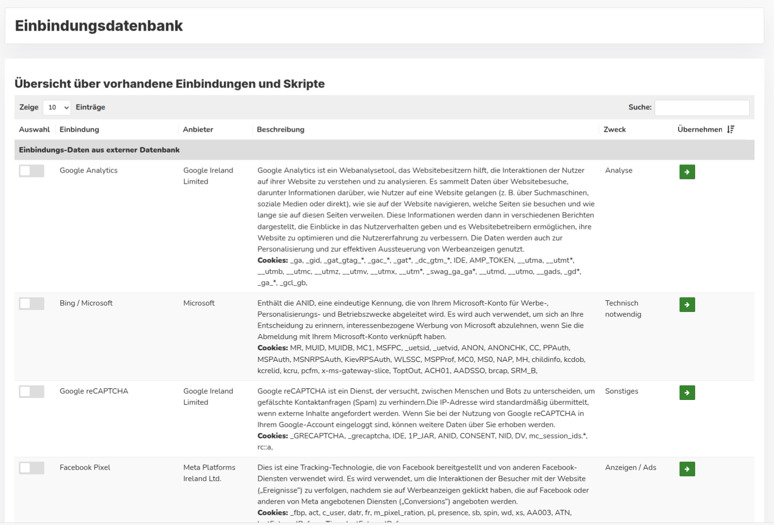 The categories mentioned above appear here again. You can assign any entry to any category. Please note, however, that you must observe the legal framework - a Facebook pixel, for example, is not technically necessary. For a precise legal classification, you should always consult a lawyer.
