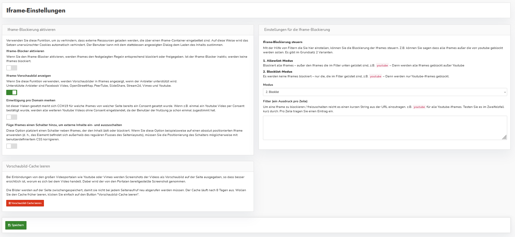 If you make this selection, all iframes that do not match an expression in the filter list will be blocked. If you enter YouTube, for example, only the iframe from YouTube will not be blocked, but all others (however, we do not recommend this procedure for YouTube!).