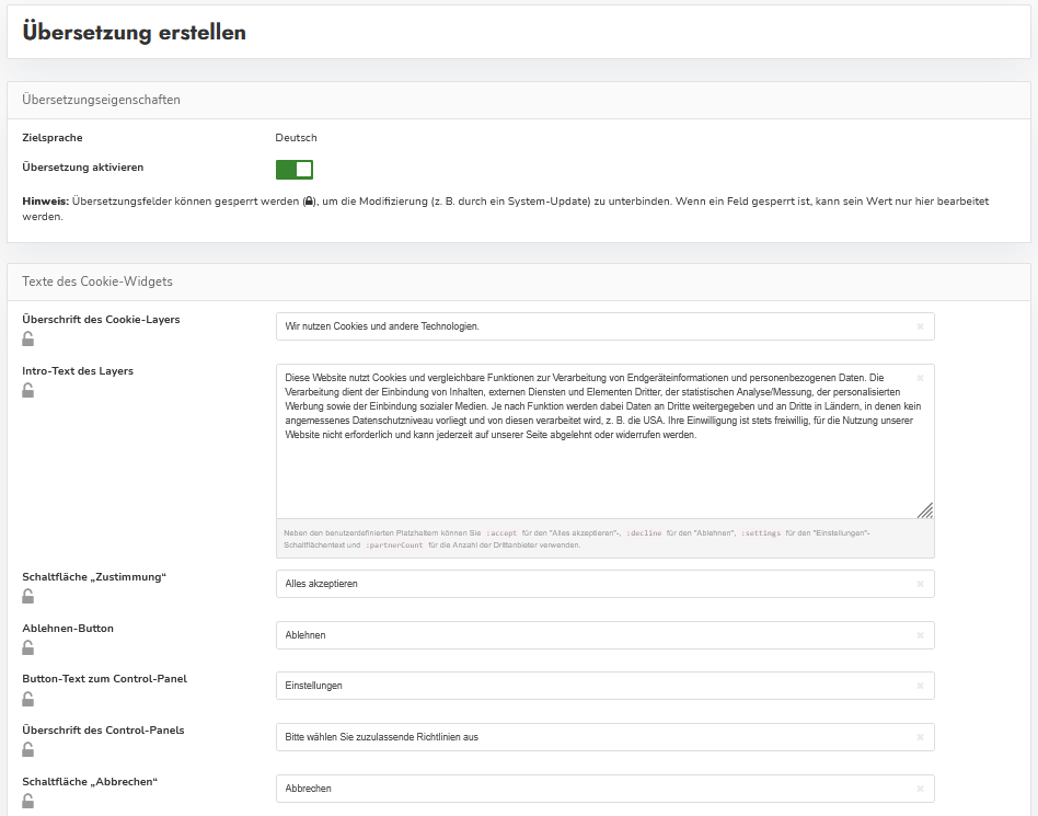 If you want to protect specially entered texts from modification (e.g. caused by a system-update), you can activate the lock-symbol. Protected texts are not overwritten during updates.