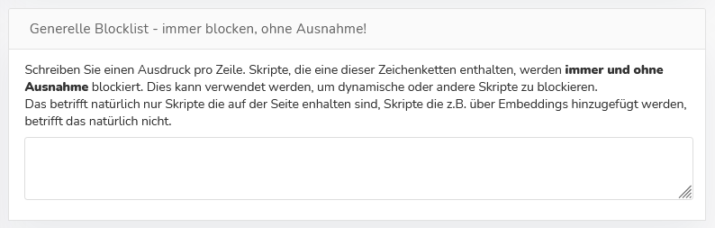If you enter something here, all scripts containing this string will always be blocked everywhere, without the users of the page having the possibility to unblock the respective script.