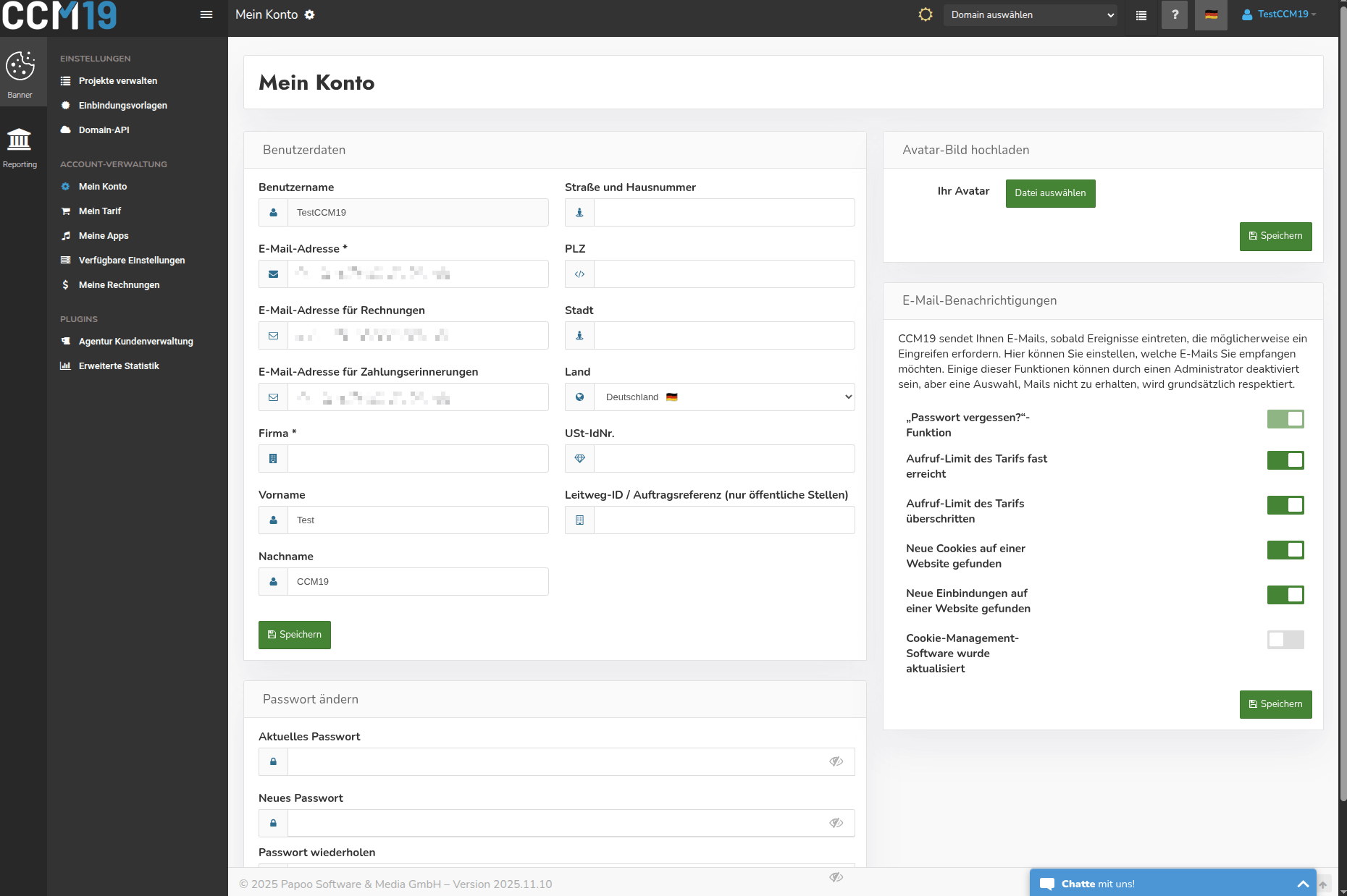 Account settings In the account settings you can change your Edit your user data (E-mail address, before-, after- and company-names, etc.) set a new password E-Mail-Control notifications Finally, click on "Save" to apply the change.