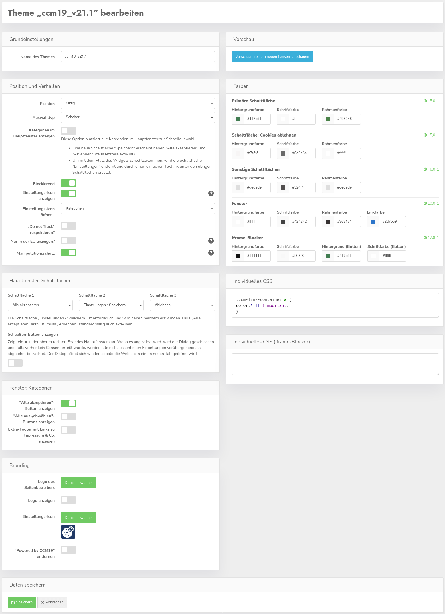 Click on the "Preview" button to get a preview of the frontend-widget with your settings. The click does not open your page, but a page inside the CCM19 admin area. A reload is required after each change to the layout. The widget is fully functional - i.e. you can test all elements of the widget.