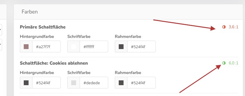 Whether the contrast is high enough is shown in color. For example, the buttons should have a contrast of at least 5:1. If the number is red, the contrast is too low.