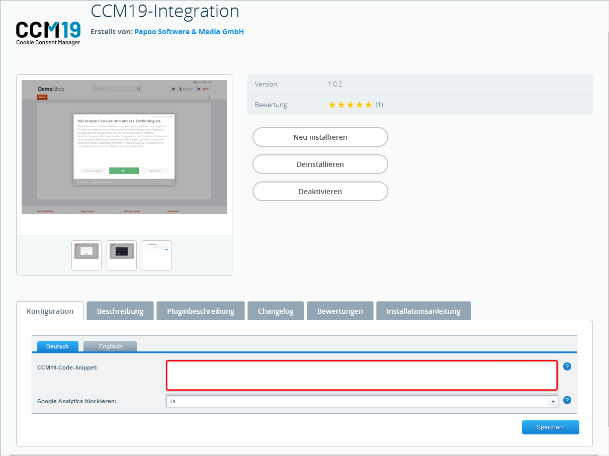 Once the installation is complete, you can insert the CCM19 code-snippet into the field provided. Please note that the "Block Google Analytics" option should be activated.