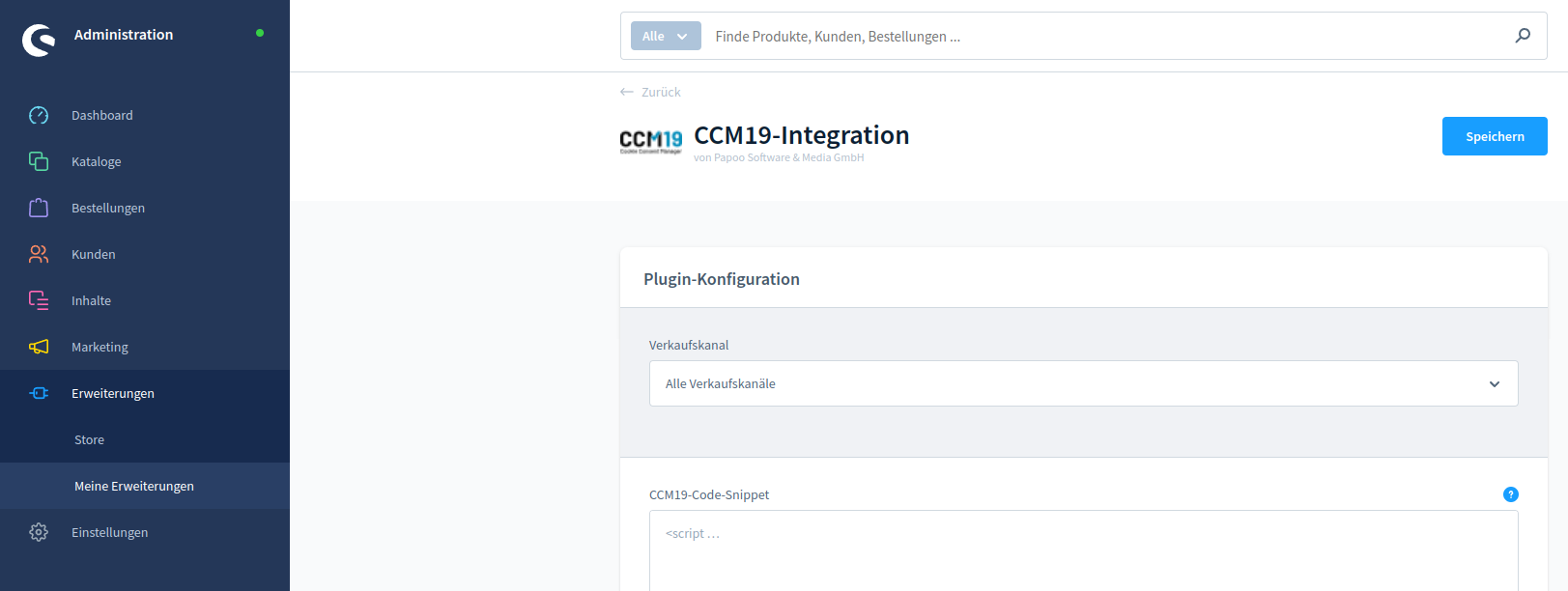 6. Add the previously copied code from the CCM19 backend to the "CCM19 Code-Snippet" field to complete the integration.