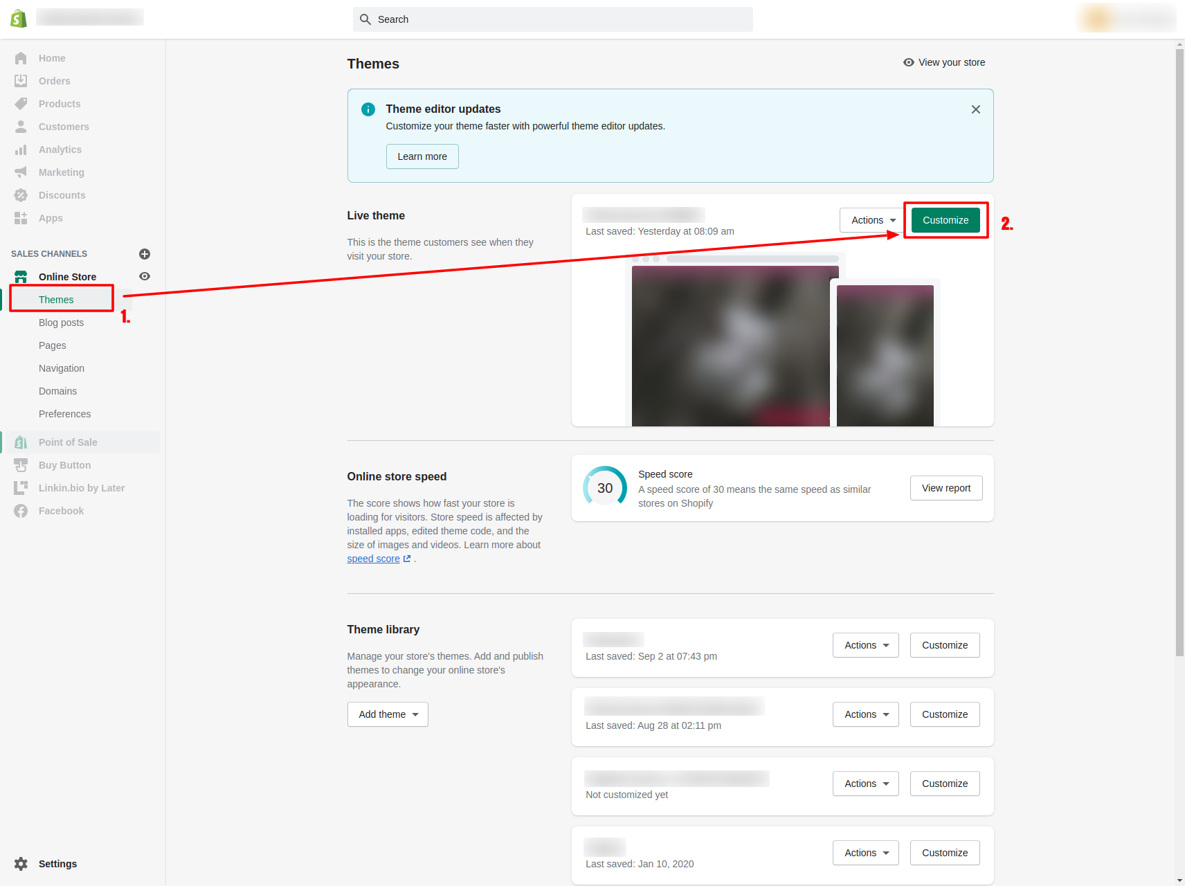 Log in to the backend of your store. Navigate to the theme-settings ① and edit your current theme ②.