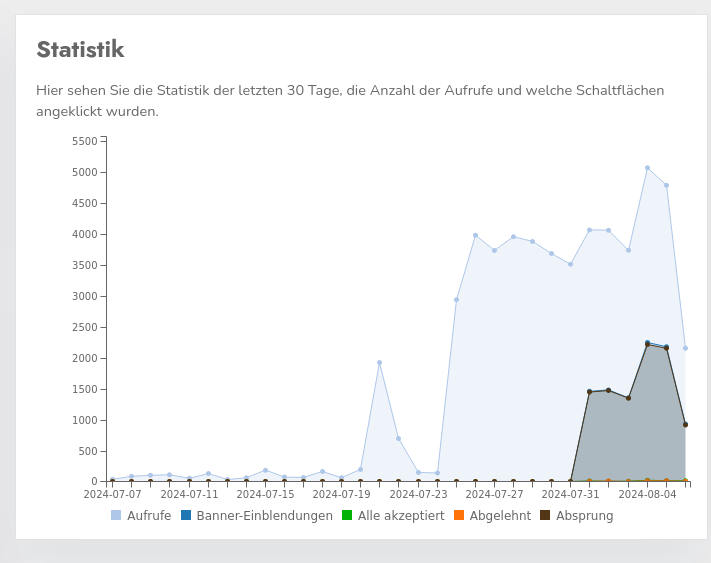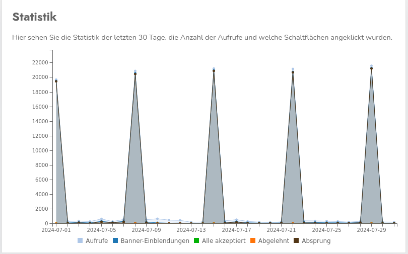 In rare cases, however, it can still happen that bot-traffic is also counted in your CCM19-account. It is usually easy to recognize in the statistics by an extremely high number of views where no interaction with the banner is recorded. Example: